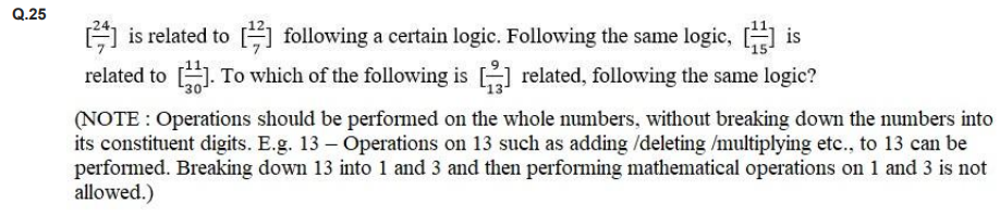 | Q.12 Select the set in which the numbers are related in the same way as are the numbers of the given sets. (213, 157), (185, 129) (NOTE : Operations should be performed on the whole numbers, without breaking down the numbers into its constituent digits. E.g., 13 – Operations on 13 such as adding /deleting /multiplying etc. to 13 can be performed. Breaking down 13 into 1 and 3 and then performing mathematical operations on 1 and 3 is not allowed) 1. (171, 123) 2. (189, 141) 3. (164, 108) 4. (192, 152) |